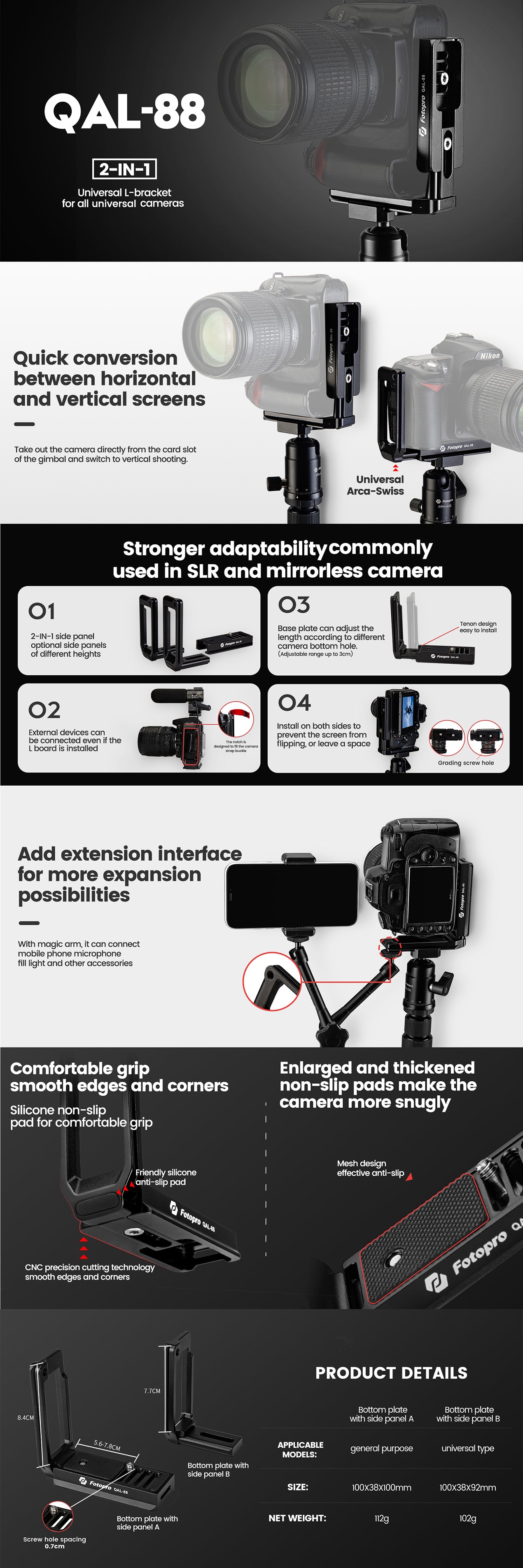 The Fotopro QAL-88 is a precision-engineered, adjustable L-bracket designed for photographers seeking seamless transitions between horizontal and vertical shooting. With its 2-in-1 adjustable side panel, it offers universal compatibility for a wide range of DSLR and mirrorless cameras. Whether you’re in the studio or shooting on location, the QAL-88 delivers the flexibility, comfort, and stability you need to elevate your photography.