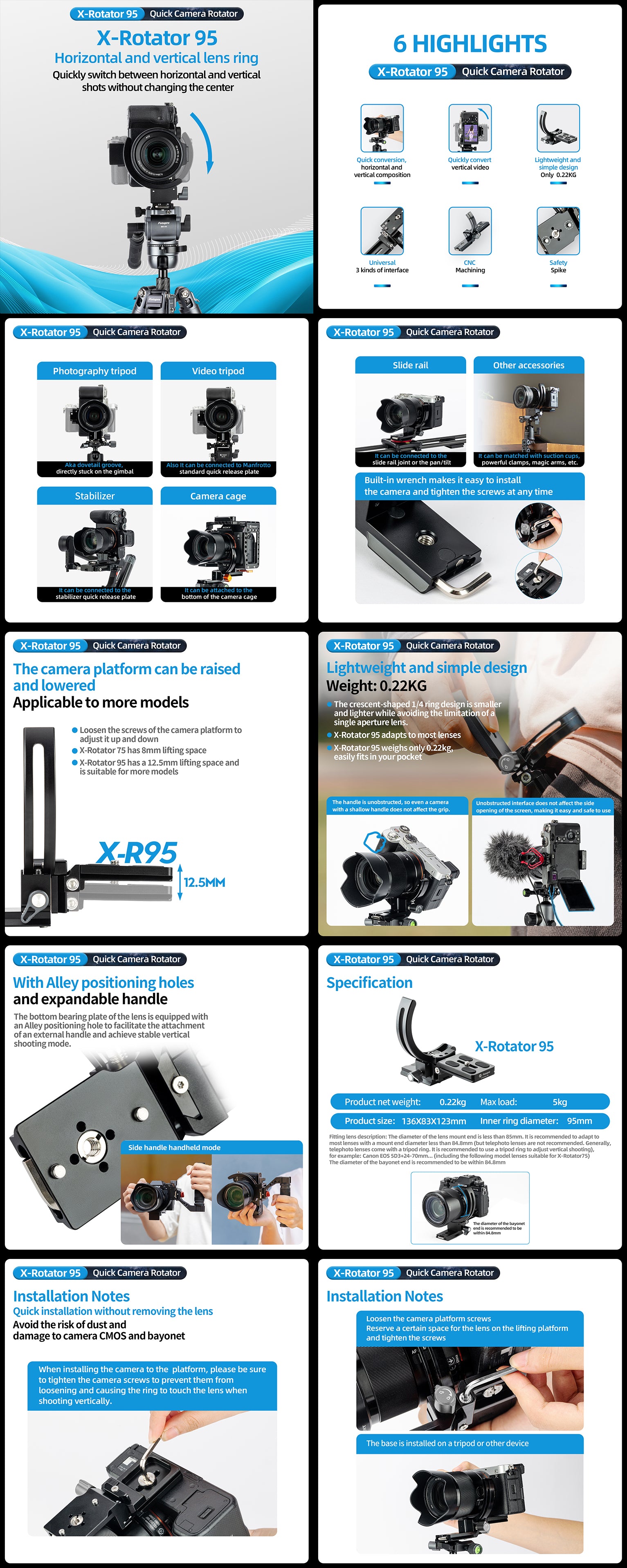 • Fast Horizontal/Vertical Change: Crescent design, no L-plate needed.
