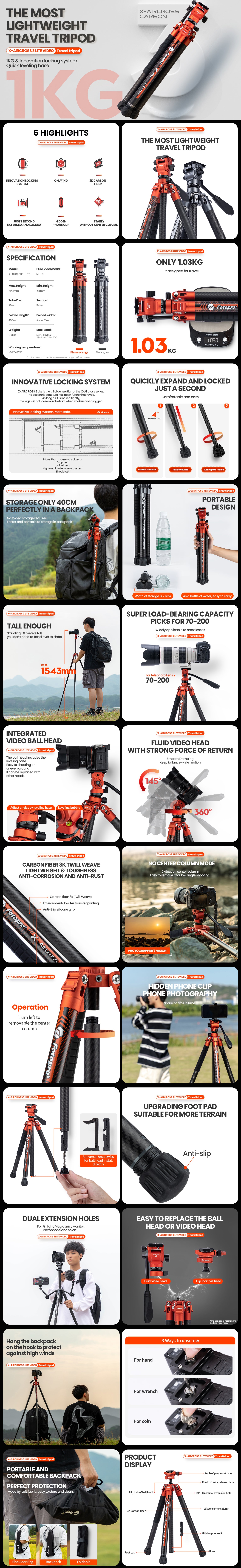 Ultra-Lightweight & Compact: Made from high-quality carbon fiber, this tripod for travel weighs only 2.27 lbs and folds down to a compact 17.9 inches. It effortlessly fits into your backpack or luggage, making it an ideal companion for travel and outdoor shoots