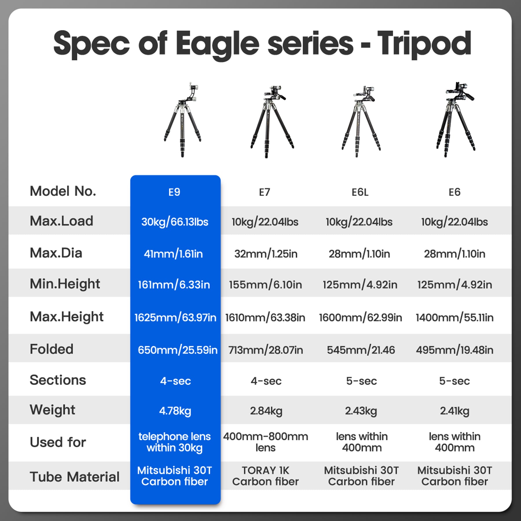 The E7 delivers the perfect balance of strength and portability, supporting 400-800mm lenses while weighing only 2.84kg. Its TORAY 1K Carbon Fiber construction ensures durability with a compact, travel-friendly design—ideal for nature, bird, and travel photographers on the move.