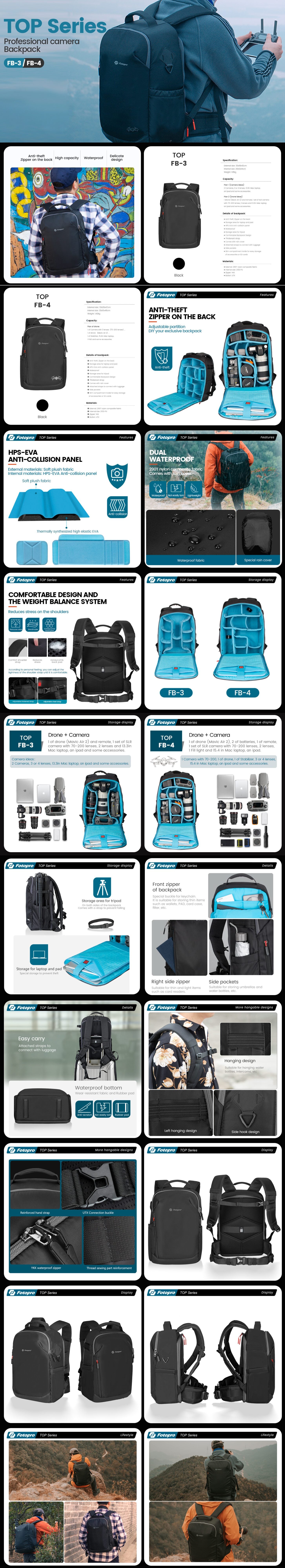 Fotopro FB-4 photo backpack is characterized by its huge capacity, carrying comfort and the possibility of personalizing the interior for different sets of video/photo equipment. The use of high quality waterproof outer materials and padded compartments ensures optimal safety when transporting your camera, lenses, drone, laptop and essential accessories.