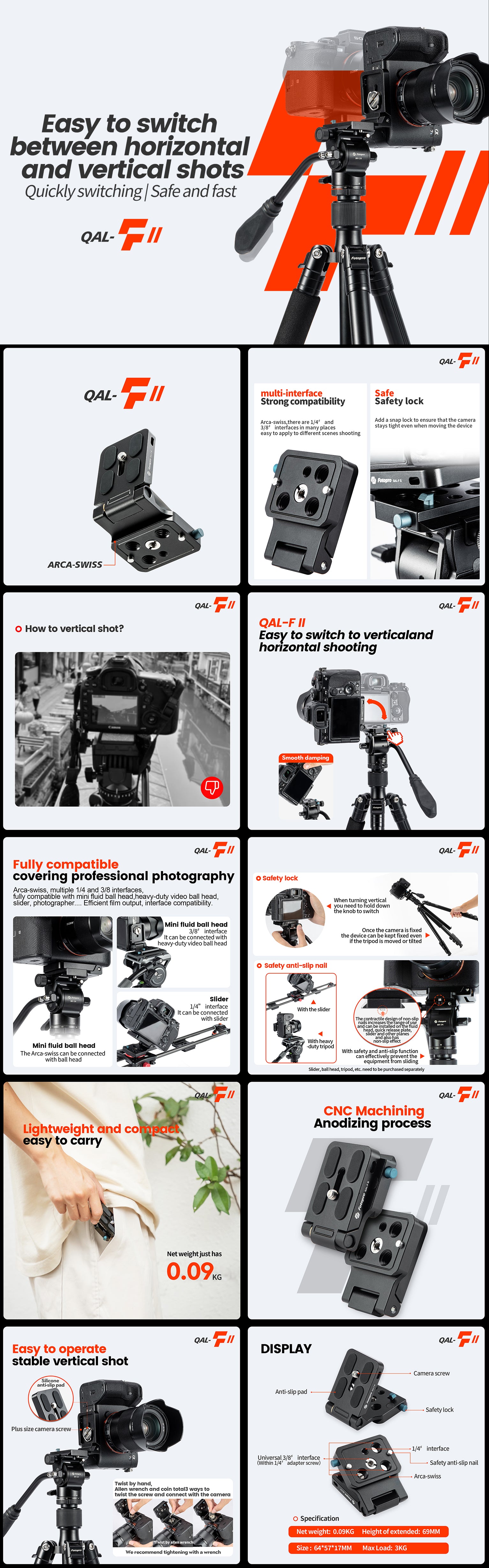 Additional Safety Lock and Nail: QAL-F II Quick Release Kit adds a snap lock to ensure that the camera stays tight even when moving the device. The non-slip nail increases the range of use and can be installed on the fluid head, quick release plate, slider and other planes. Both can effectively prevent the equipment from sliding