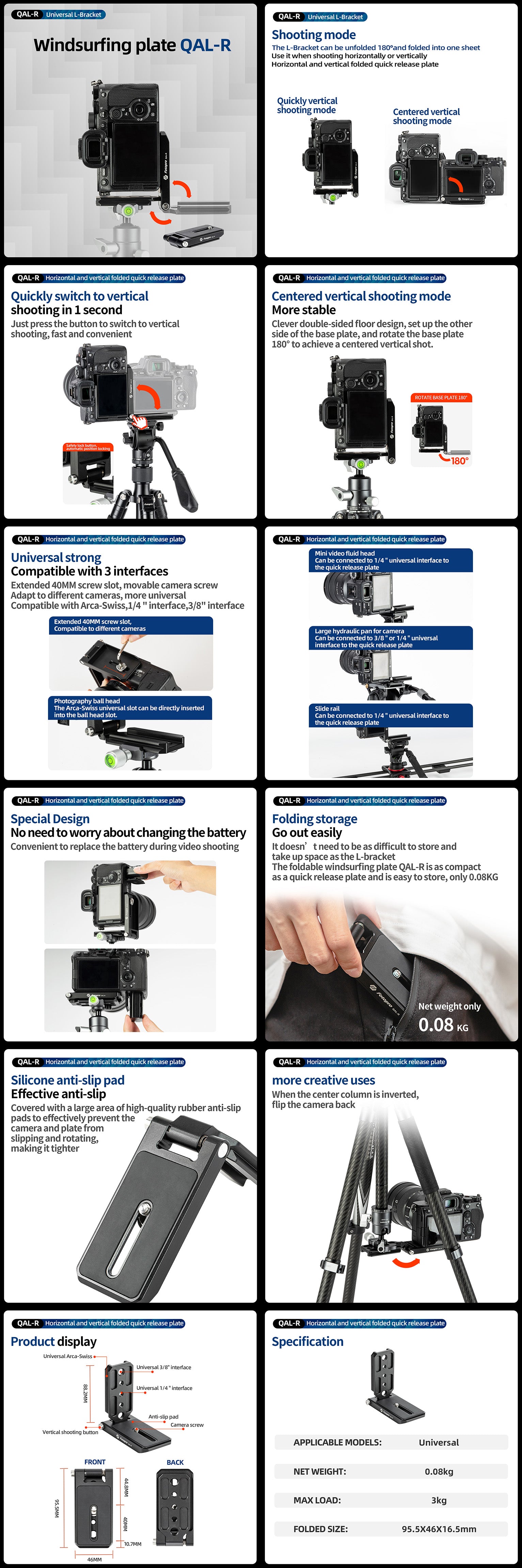 Fotopro QAL-R vertical folded quick release plate supports both landscape and portrait recording and is compact, lightweight, flexible, quick and easy to use. This Universal L-Bracket is designed to be used in a similar way to a camera plate and mounts directly to your 3/8" or 1/4" thread tripod or monopod head, allowing you to switch between landscape and portrait modes instantly.