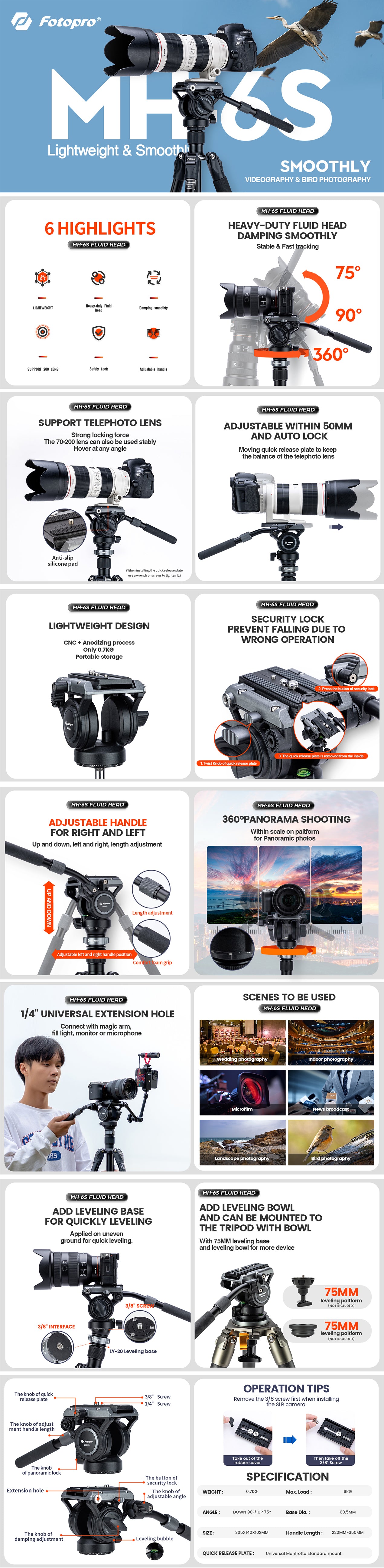 Create smooth pan and tilt moves with your midsize camera rig using the lightweight MH-6S Fluid Video Head from Fotopro. The sturdy fluid head features a flat base for mounting onto a separately available pro tripod or monopod using its 3/8"-16 base thread. Its maximum load capacity is 13.2 lb, and it weighs 1.5 lb. A 1/4"-20 thread on the side of the head can be used to mount an optional extension arm or accessory.