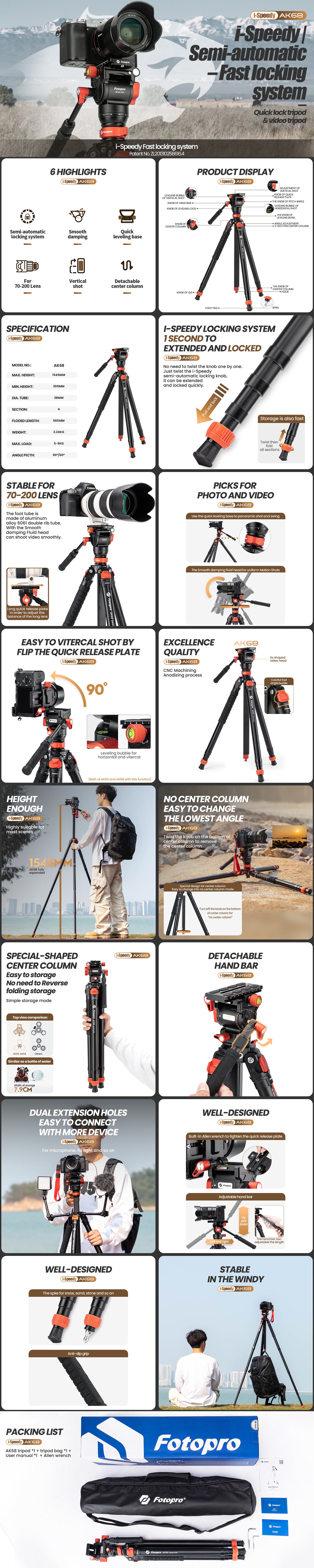 1-Second Semi-Auto Locking: Easily and quickly extend and lock the aluminum legs from 7.9” to 60.8” by twisting the i-Speedy semi-automatic locking knob. Storage is also fast by twisting one knob then folding all sections