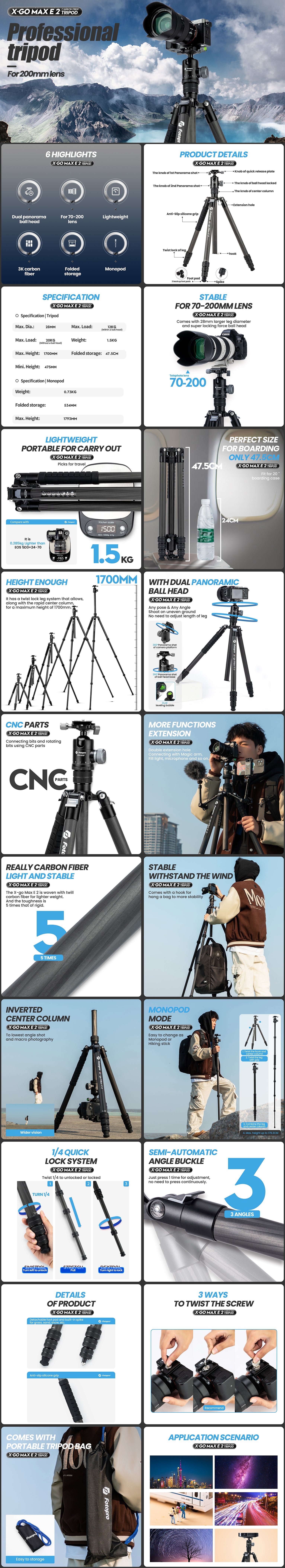Built for serious photographers who demand both strength and portability, the Fotopro X-Go Max E 2 delivers maximum performance in a travel-ready format.