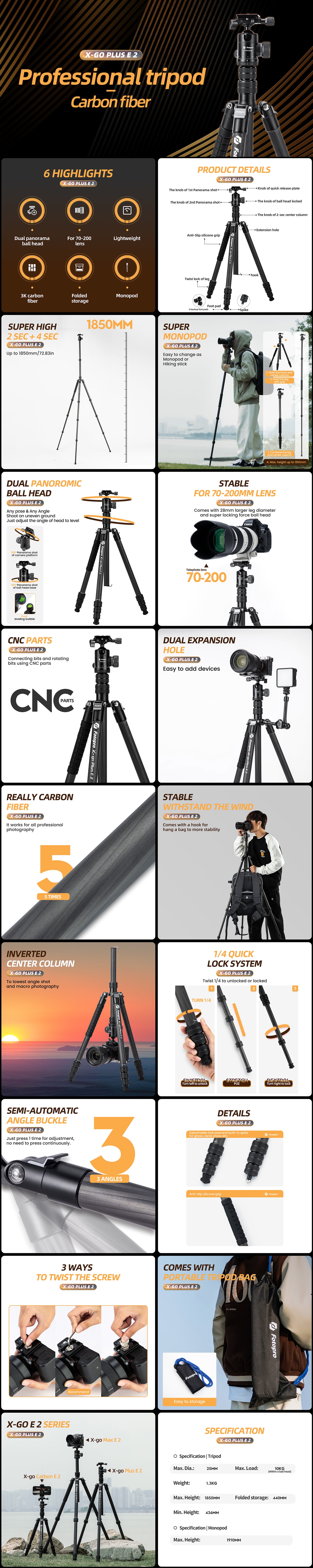 ·  This Fotopro Tripod X-go Plus E2 offers versatile shooting with its 4-section legs and 2-section center column, enabling height adjustments from 436mm to 1850mm.