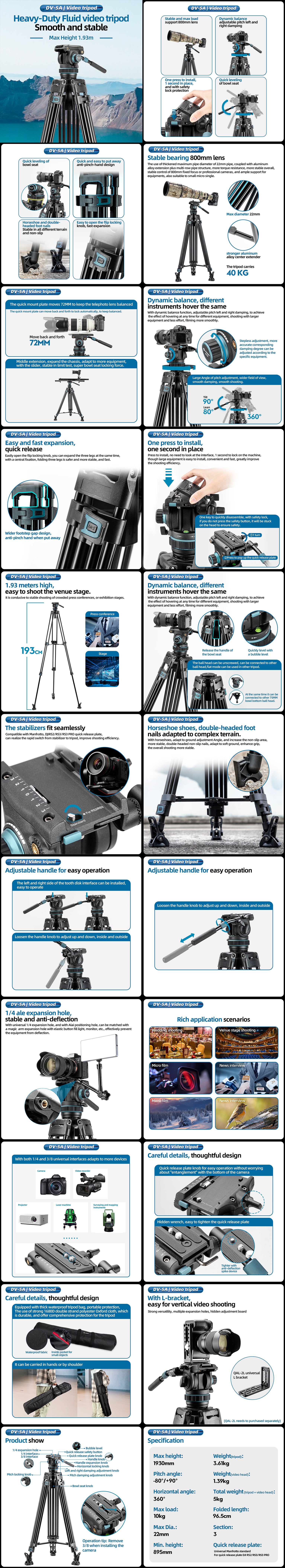 - 22 lb/10kg max load with video head (Only tripod 40kg)